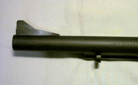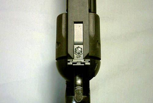 アジャスタブルリアサイト。両サイトのお陰でSAAというよりルガーブラックホークの様相を呈してくる。(そもそもこのニューフロンティアはブラックホークの対抗品なんだから当たり前か)ハドソンのアジャスタブルリアサイトはなんとコクサイのコルトパイソン用を使っているそうだ。買ったとき、スクリュー類が欠品していたのを嘆いた時、ネットでお世話になった方からリアサイトを分けていただいた。 |