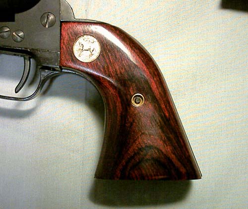 美しい木目のコルトメダリオン入りの木製グリップ。ひょっとするとコルト社純正? |