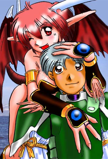 龍甲戦士のブラウニーと龍少女シャルム。7月31日まで使っていたトップ絵でキャラクターの成立は古くて高校時代にまでさかのぼる。遥か昔、ゲーム会社の面接の際、このキャラ(他数点)を提出してとりあえず面接権利は得たものの集団面接で落とされる(笑)。北州やはり人格に問題あり。