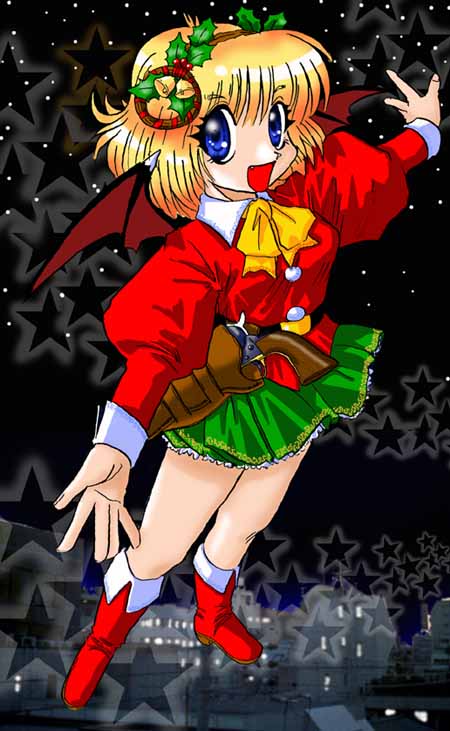 2003年のクリスマスの時期を狙って描いたCG。NorioさんのHPに掲載されたサンタ姿のクミコさんを見て「くわ〜っ!可愛い〜!やっぱりこの時期にサンタ娘は基本か!」という事で急遽製作。Topにバストアップを掲載しただけだと思っていたら何時の間にか全身をアップしていたみたいで早くもボケ進行か!?俺。