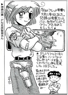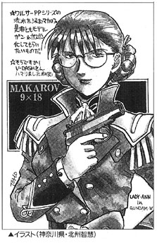 | 1994年12月号で「ブギーナイト面白いよ〜ん」と描いたところ自分の投稿を見て聴き始めた方がいらっしゃって感激。その方がGガンダムのレインを描いていた(最初で最後のカラーページ・・羨ましい)ので自分はガンダムWのレディ・アンを描く ○マカロフ |