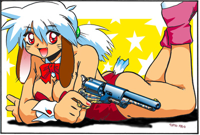 パソコンイラスト描き3枚目。ブラシ作業に疲れてアニメ塗りに変更。鉄砲に関してはブラシ、グラデと力を入れる。ケースハードが結構上手くいっている。構図的にお気にのひとつ。裏コンのギャラリーにも掲載されている。