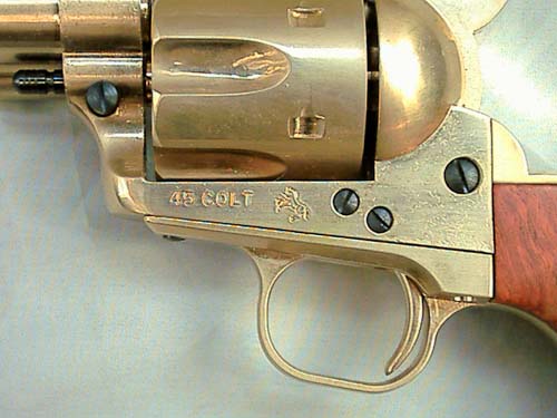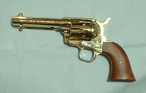 これは現在流通しているマルシンSAA。刻印が「45COLT」にランパントコルトが配している。表面は22金メッキ。何処かの鉄砲雑誌で東京ディズニーランドのSAAとしてこちらの方が紹介されていたので上の旧タイプはもうなくなってしまって現在流通しているこちらのタイプが置いてあるようだ。そういえばどっかの通販でグリップを換えただけの「明治天皇のピストル」という形で49800円で販売(通常は14800円。グリップだけで35000円もするのかよ!)ちなみに自分は普通のショップで新品で6800円で購入。 |