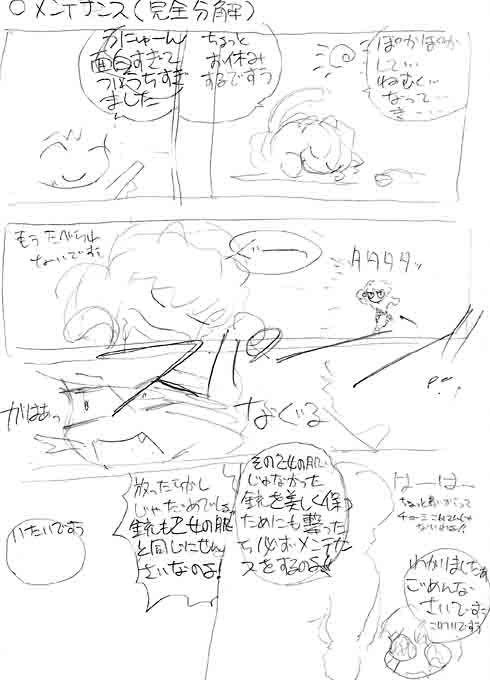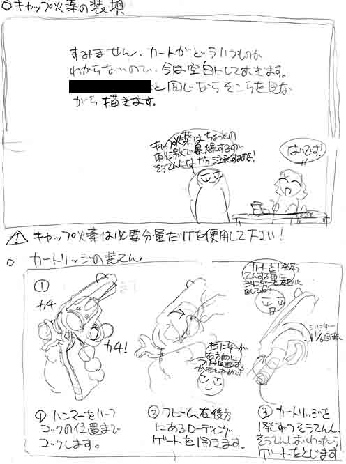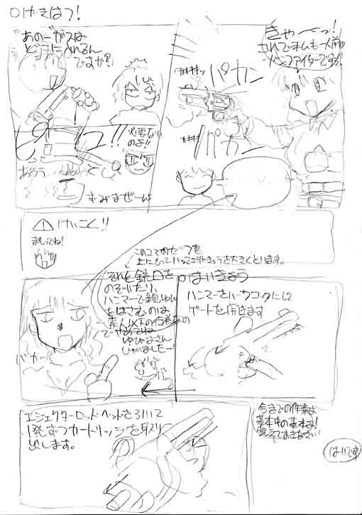 おっ、面白いもの発見。これは某トイガンメーカーで出される予定だったモデルガンの取扱説明書のコンテ。どういう訳かしろうとに話が舞い込んできて気合を入れて取り組もうとしたが、肝心の製品の仕様が分からず仕舞で結局うやむやの内に切られてしまいました。内容は二人の女の子がボケツッコミを入れながら話を進める漫画形式で、これが実現したら、きっと同人誌並みの容量になったことでしょう(笑)もう大分昔なので時効ということで載せちゃいました。