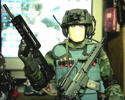 上の投稿のモデル、サイボーグ「ベルク」。 北州が月刊Gun誌2003年1月号に投稿したサイボーグ「アル」の同型機。 手に持っているのはFA-MAS(ありがたき御提供様は、さと様)首にかけているのはH&K