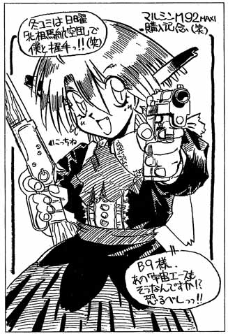 今回はコミックマーケット開催記念(笑) これは漫画ばんがいち2002年2月号掲載物。丁度投稿時期にマルシンウインチェスターM92MAXIを買ったので一緒に描いてみる。左手に持っているのは○レッタM92F。「宇宙エース〜」の件は、前々月に「手のひらを太陽に」の作詞者がアンパンマンのやなせたかしだったという投稿に「宇宙エースのうたの作詞者もやなせさんですよ」との投稿のリアクションである。そういえばこのときのコミケの裏コンブースはえらい来客者で裏コン及び北相馬のメンバーがてんてこ舞いだった。 |