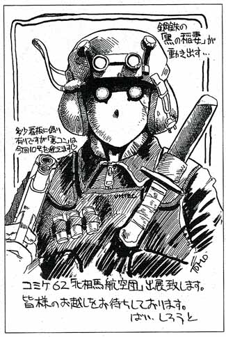 こちらは漫画ばんがいち2002年8月号掲載物。このときは丁度裏コン10号ということでそれらしいコメントを入れてみた。「鋼鉄の〜」の件は北州の漫画「黒の稲妻」をアピール。ちなみに「黒の稲妻」はロボット物ではなく航空自衛隊勘違い空戦物(長ッ!) どんな内容かは裏コンHPで確認してちゃぶ。 このときのコミケの北相馬のブースは来客少なめでちょっと暇してた。やっぱり女の子描かないとだめかな〜。手に持っているのはコルトガバメント。 |