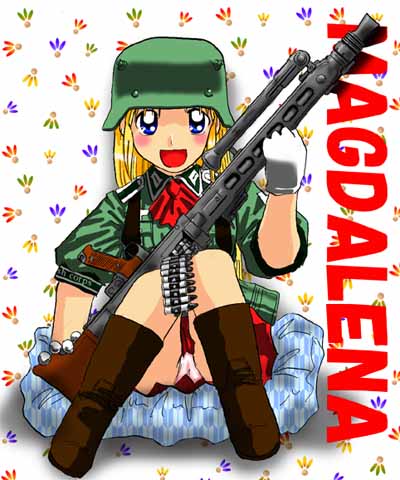 しろうとの持ちキャラ「マグダレーナ」とMG42。アニメ塗りのあっさり風。リンク記念やら何やらで贈った画像。しっかし新しい魔法少女が出るたびに「好きです〜」という声を聞くのにこいつだけは今だに好きだという声を聞いた事が無い。マグダレーナ、つくづく不幸なキャラクターである。