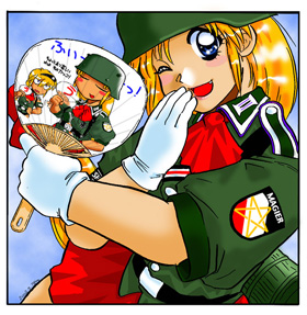 2002年夏うちわ用絵で持ちキャラ「マグダレーナ」。手に持っているうちわの絵は2001年の夏うちわ絵。実はこれ、漫画の感想をくれた方の為のお礼の絵で、そのオリジナルは「裏コンバットコミック」で飾られていた(今は無い)。キャラクター自体主人公なのに人気ゼロ(爆笑)
