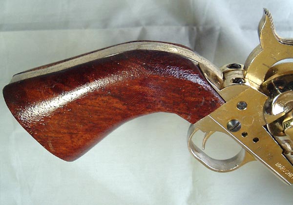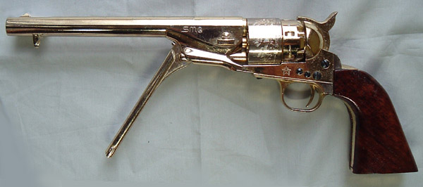 マルシンコルトM1860ニューモデルアーミー。 デニックス社製の1860アーミーとは全く異なるスタイルだが、実銃のコルトアーミーとしてはこちらが正解。 今までの直線的なラインから流れるような曲線のラインが美しい。 |