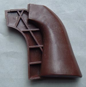 グリップ部。マルシン側で木製グリップが用意されていたかは疑問だが、オリジナル通りのワンピースグリップはグリップフレームの関係で装着する事は出来ない。 |