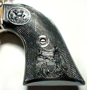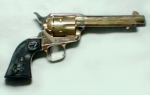 CMCピースメーカー。52年規制以後のモデルであり、CMCピーメの最終型。銃身長は51/2(フロンティア)。アサヒイーグルで開眼した北州はどうしてもピーメが欲しくて初めてバイトして、CMCにて購入したモデル。本当は銃身長71/2(キャバルリ―)か43/4(シビリアン)が欲しかったのだが既に無くなっていた。 スタイル的にはグリップフレームのラインに若干難有りだが、早撃ちを意識してやや前傾したフレームは攻撃的な印象を与える。 |