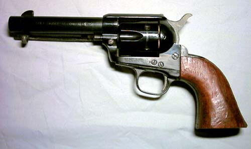 写真のSAAは後のロットのもので、フレームはヘビーウェイト、バレルがABS、グリップフレームが亜鉛合金となり現在に至る。発売後、ハートフォードのSAAは自社だけでなく様々なショップやワークスでファストドローカスタムが生み出された。写真の様に独特のベースピンオーバーラン防止の処置を施されたシリンダー、内部はスムーズにコッキングする為に様々な工夫が施された。写真のファストドローカスタムはレザーアートケインのグリップが付けられている。 |