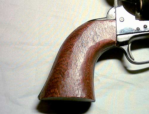 通常はプラのグリップが付いていたのだが、度重なる落下でねじ部分が逝かれてしまい自作でグリップを作ることに。ワンピースグリップが実は貼り合わせだったことを知らなかった北州はブロックのカリン材を買って将に"ワンピース"のグリップを彫り上げた。(凄く大変だった) Gun誌の早撃ち大会で持参した時グリップを誉められて努力が報われた。 |