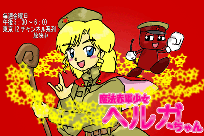 | キター!!(笑)「ソ連征けソビィ君」の不愉快な仲間(笑)チェカー君と「マジカルマグダレーナ」のソ連魔法少女のヘルガの夢のコラボレーションですよ〜!!あの憎たらしいヘルガも元さんの手にかかればめっちゃカワイイ魔法少女に変身だ!それにしても12チャンネル系列がマイナーさ爆発!!(爆笑)どうもありがとうございました!! |