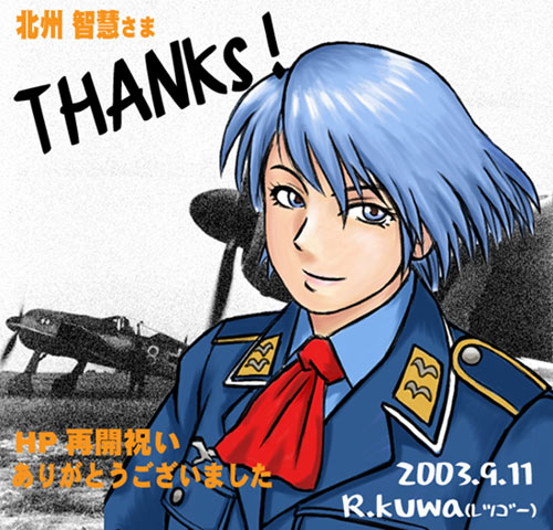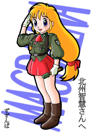 どーYO!!すげーZE!!なんとずずんぱ様が描かれた独逸魔法国防軍少女三人組ですヨ!!突然予告無しにずずんぱさんのHPのトップを飾られたのを知らずにスルーしてしまったのは痛かったな〜。これも以前にずずんぱさんの絵をまんまパクった上に本人に送った(今考えるとまた無謀な事をしたモンだ)お返しかな〜。でもこんなお返しだったらいくらでもOKかな。しっかしめんこいな〜♪しろうとの描く三人よりも可愛く、尚且つディテールもずずんぱさん流のこだわりを感じるぜ!!どうもありがとうございました! |