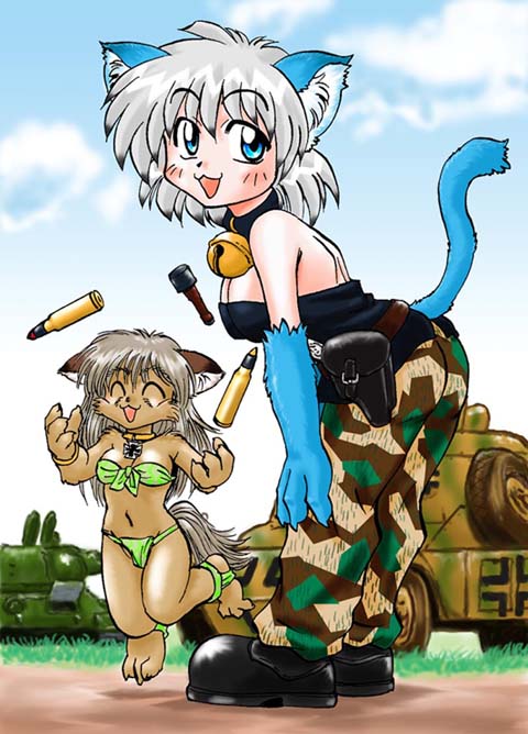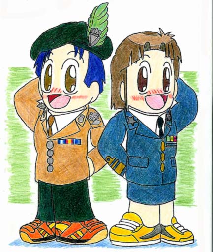 | 裏コンのHPや同人誌などでお世話になっているSchneider様からイラストを頂きました〜!「熱血最強ゴウザウラー」の朝岡しのぶ嬢(英国陸軍アイルランド連隊軍服着用)と光主エリカ嬢(イタリア海軍軍服着用)です〜。今は亡き「コンバットコミック」の読者欄で展開されていた「第三傾国」のDNAの継承者で軍用・公用を問わずその制服の知識とエルドランシリーズにかたむける情熱はまさに素晴らしいの一言です!どうもありがとうございました! |