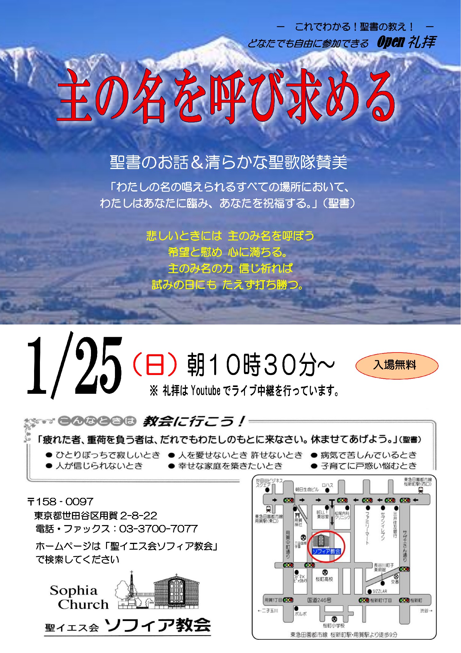 ソフィア教会では、2024年1月より、日曜日の礼拝、教会学校の時間を以下の通り変更いたします。